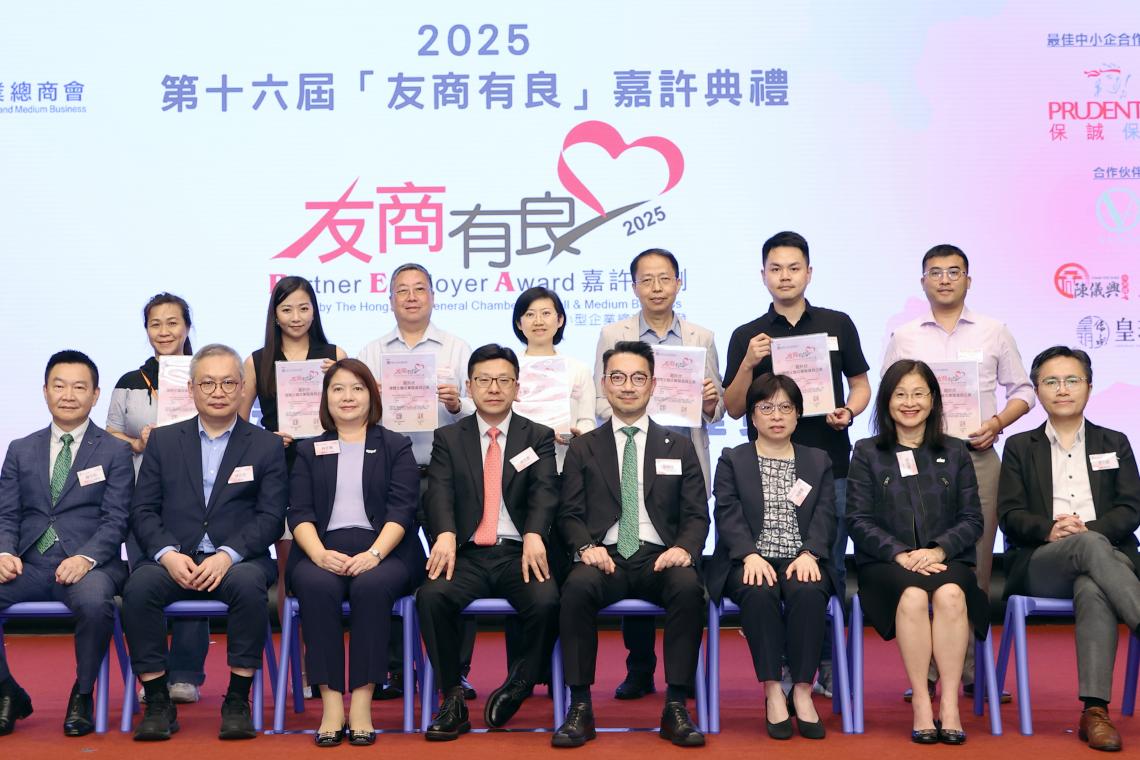 圖中:2025年9月12日,本公司代表高級物業經理 Jackson Leung 先生(後排左3)接受嘉許狀合照,前排(左4)為「勞工及福利局局長」孫玉菡, JP